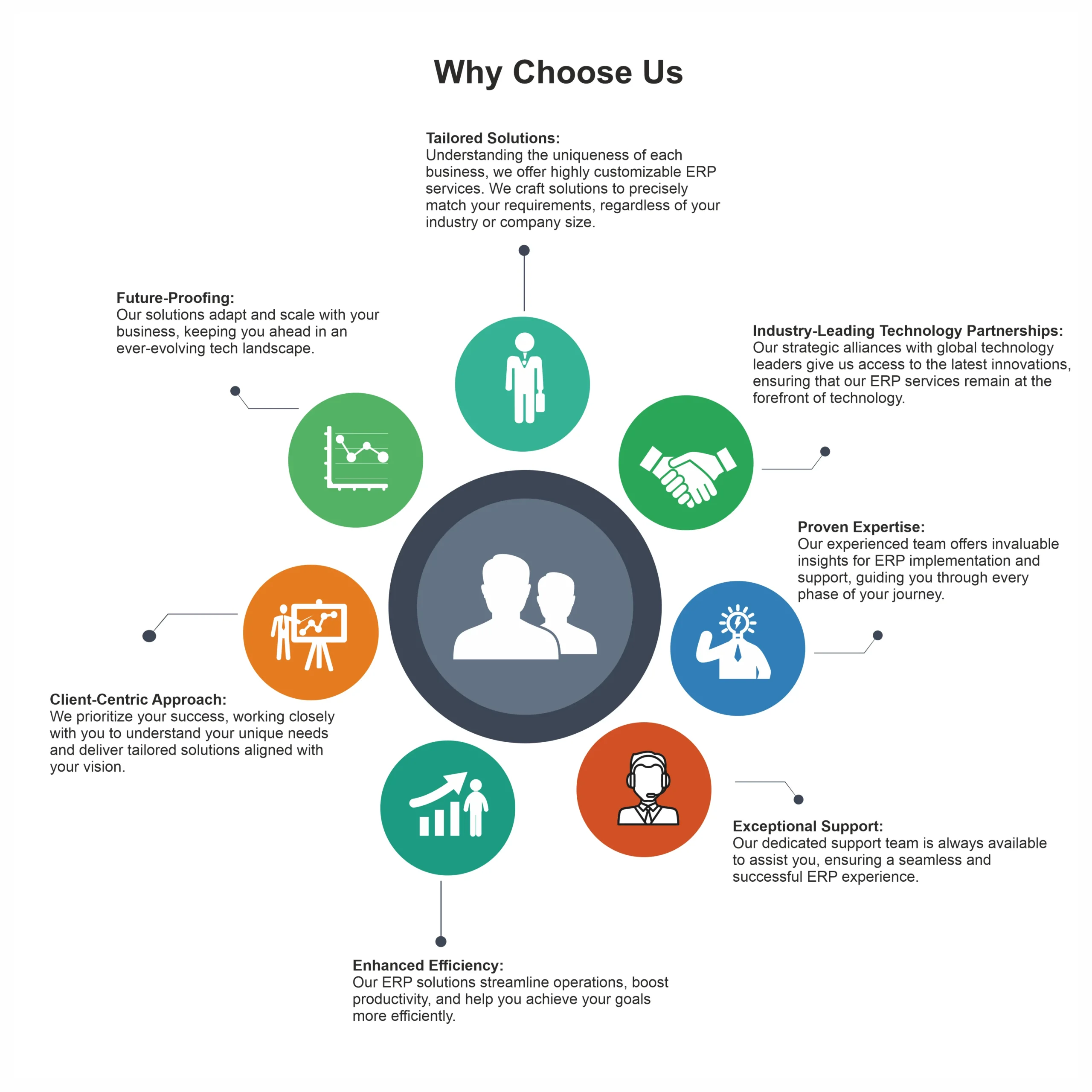 At ERPGenX, we specialize in helping businesses choose the right ERP system. Our process includes assessing your needs, evaluating vendors, offering customized solutions, and conducting ROI analysis to ensure a strategic and cost-effective choice.